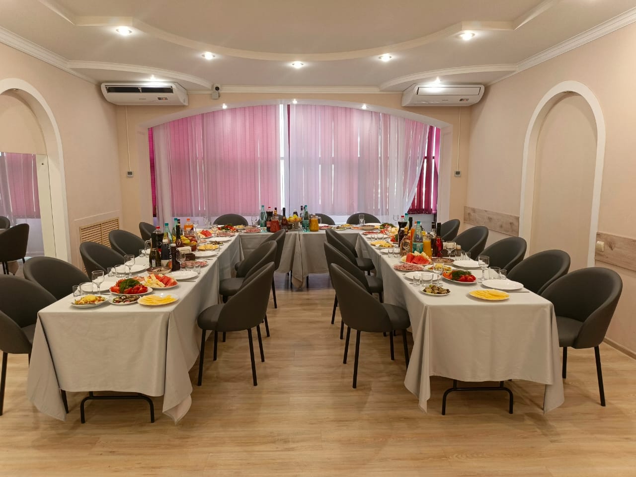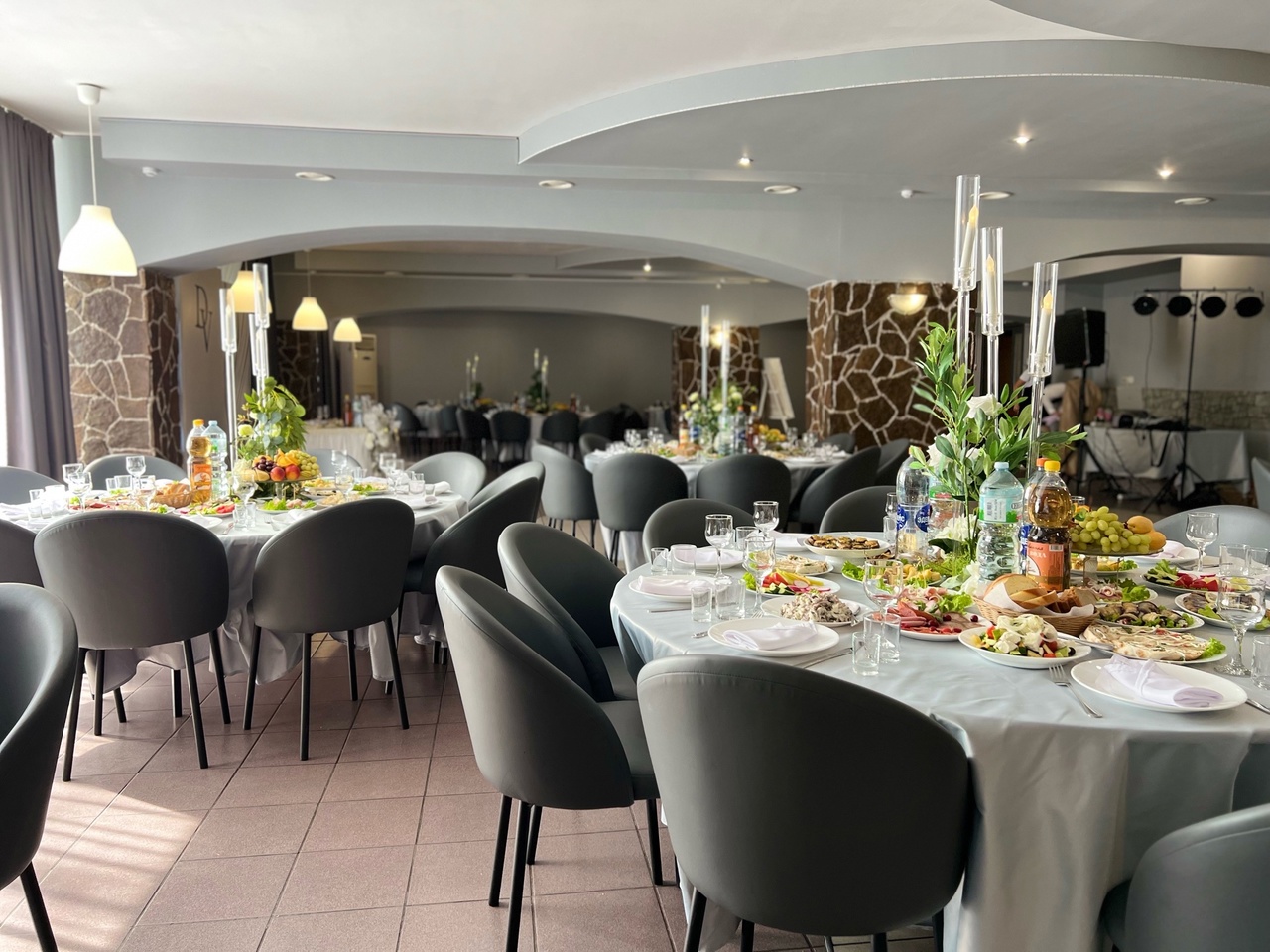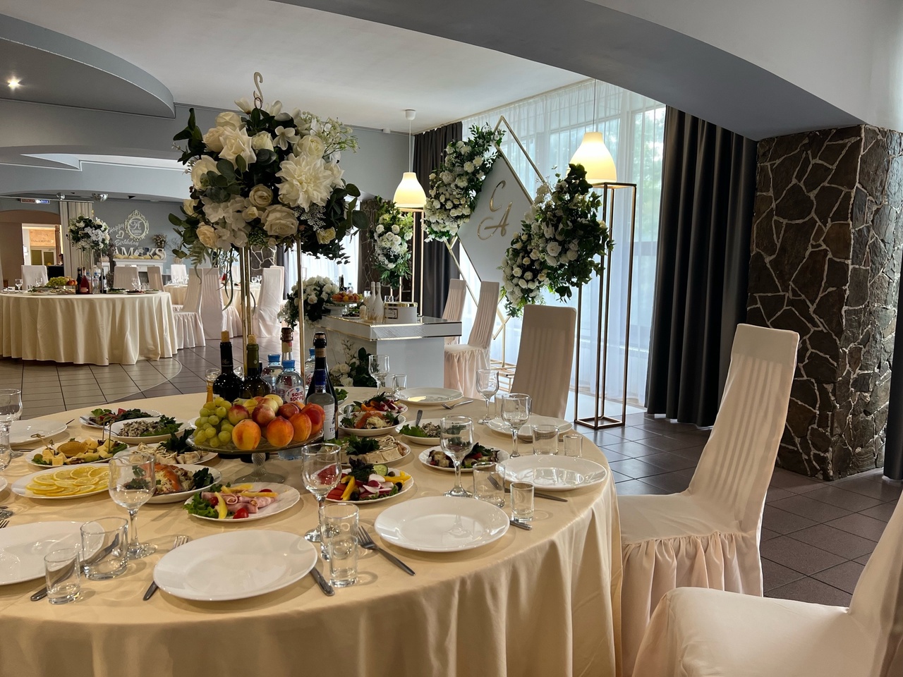 Зал предназначен для проведения больших торжеств. Сцена для выступления музыкальных групп, высокие потолки и панорамные окна.